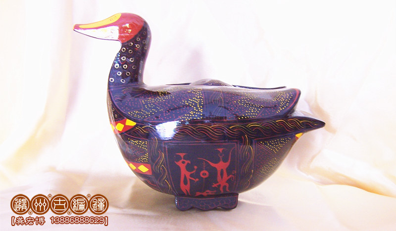簡介:鴛鴦盒為木胎其身,體分兩半,制作再粘合成,頭頸與身體則榫卯相連,故頭能自由轉(zhuǎn)動。背上有一長方形口與蓋相扣合,蓋上浮雕龍紋。整器外髹黑漆,其上用紅色和金色描繪眼、嘴、羽毛以及菱形紋等。在它的腹部還描繪了建鼓舞和撞鐘擊磬的情節(jié)畫。