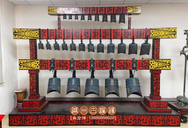 26件木結(jié)構(gòu)演奏級(jí)編鐘,是一套專業(yè)演奏類古樂(lè)器,整套編鐘分3層懸掛排列,由長(zhǎng)短不同的三根彩繪橫梁和4個(gè)青銅佩劍武士立柱及2根圓立柱組成。編鐘由錫青銅鑄造而成,采用國(guó)際標(biāo)準(zhǔn)樂(lè)音音高A=440Hz調(diào)音,一鐘雙音,十二半音齊備,可以旋宮轉(zhuǎn)調(diào)演奏古今中外樂(lè)曲。編鐘下層懸掛5件倍低音甬鐘,音色低沉渾厚,在演奏中起烘托作用,使用鐘棒撞擊發(fā)音。中層12件編鐘從大到小依次排列,音色淳樸清澈,用于演奏樂(lè)曲主旋律。上層9件為倍高音鐘,音色清脆悅耳,用于演奏高音及復(fù)試旋律搭配。編鐘的彩繪橫梁采用優(yōu)質(zhì)實(shí)木板制作,表面噴漆并彩繪花紋;整套配套演奏工具一套,教學(xué)樂(lè)譜,另配有保管編鐘用的木箱,便于運(yùn)輸和儲(chǔ)存。