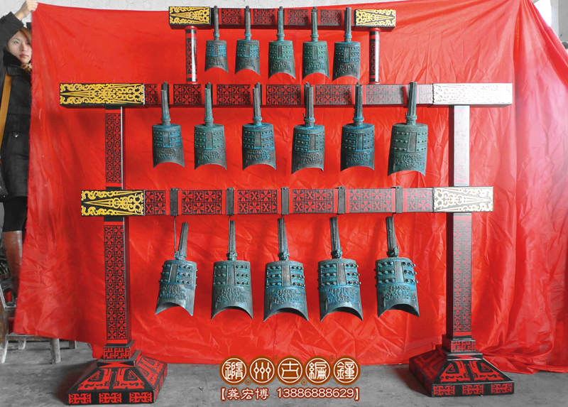 16件套系編鐘規(guī)格:長2米×寬0.4米×高1.8米,編鐘為青銅鑄造而成,表面顏色為古銅綠色,編鐘音域3個八度,從低音5至高音5,最大口徑25厘米,最小9.5厘米。